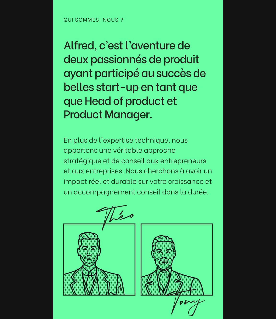 Plongez dans l’univers d’Alfred, avec une identité visuelle inspirée des comics : couleurs vives et contrastes marqués. Les illustrations, conçues comme des planches de bande dessinée, s’intègrent harmonieusement dans un design moderne et tech.